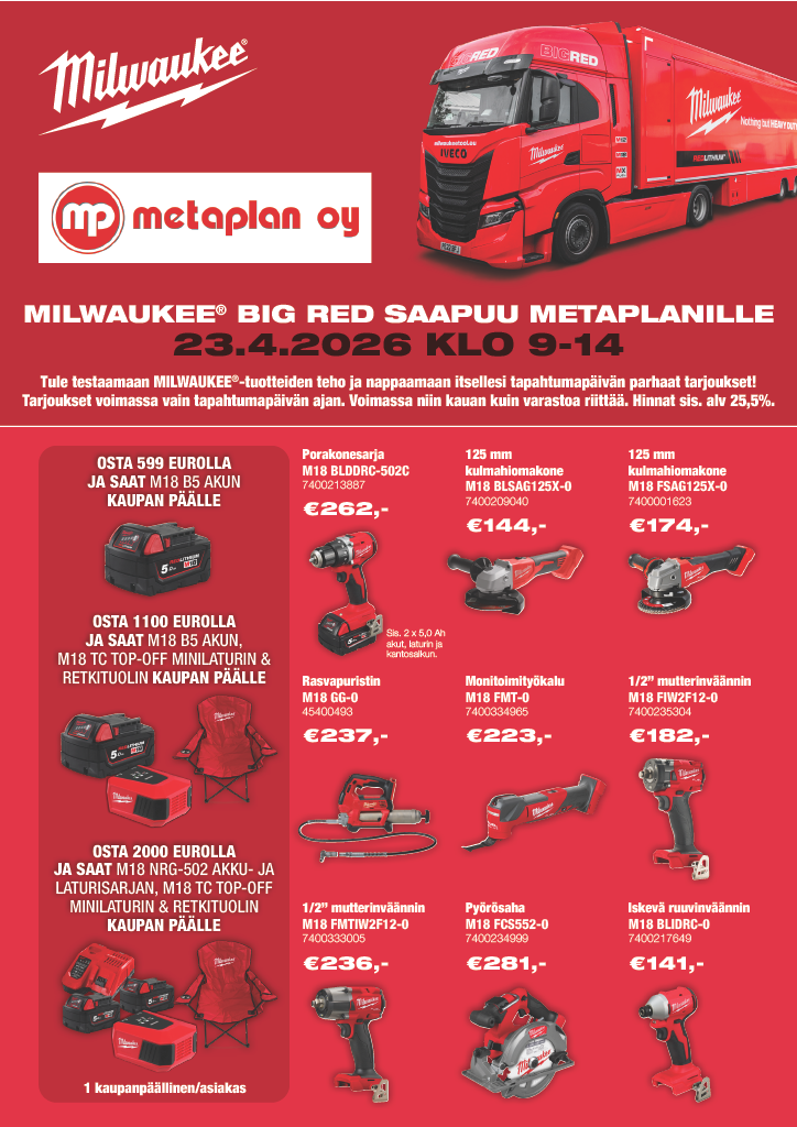 MILWAUKEE® BIG RED SAAPUU METAPLANILLE 23.4.2026 KLO 9-14